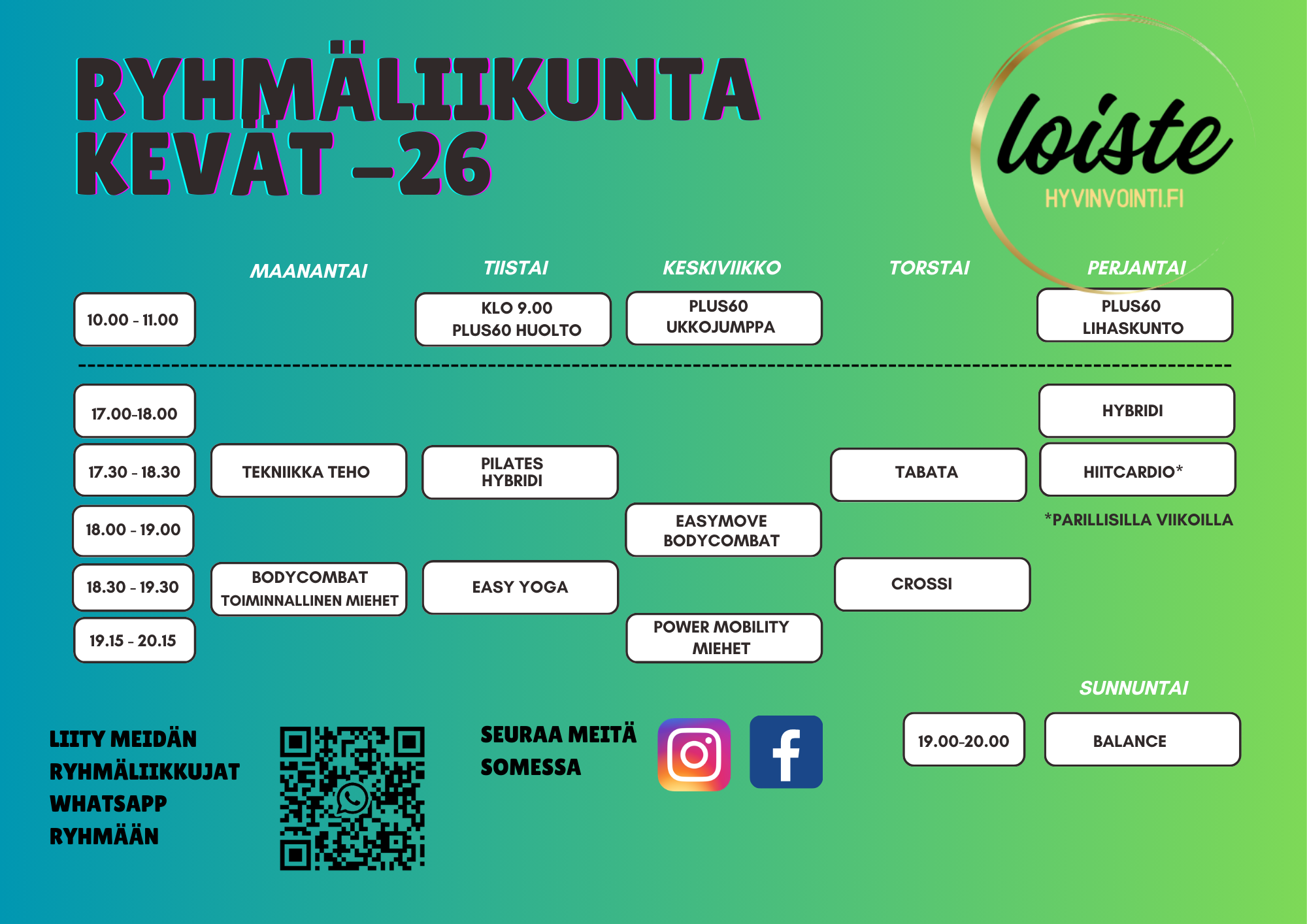Paikkavaraukset sekä peruutukset tunneille viimeistään 2h ennen tunnin alkua https://loistehyvinvointi.fi/ajanvaraus/